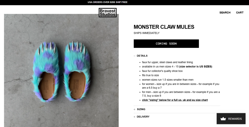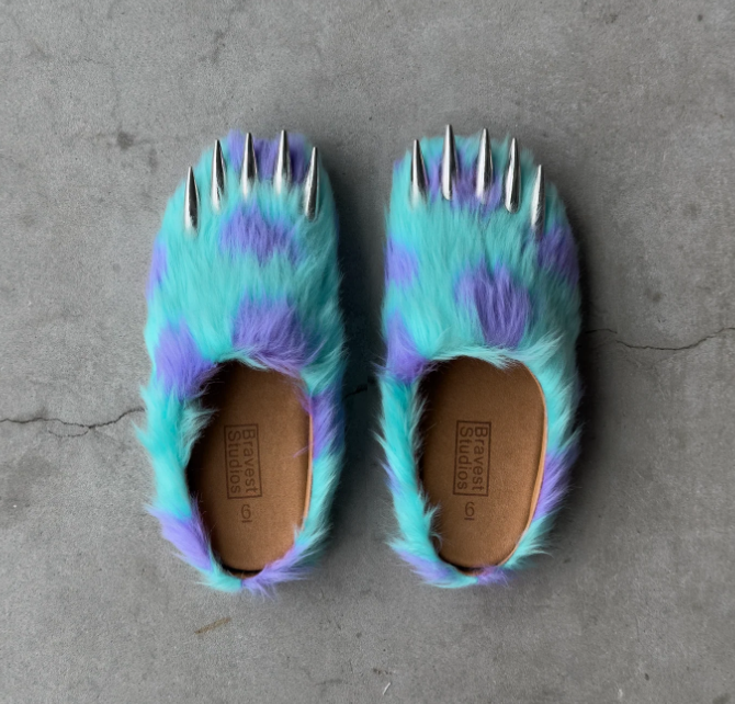 Bravest Studios「Monster Claw Mules」は、遊び心溢れるデザインが特徴の限定コラボスリッパ/ミュールです。人工毛皮を使用したアッパーに、つま先部分の金属製“爪”モチーフを配し、インパクトあるルックスを演出。コルク製フットベッドで快適な履き心地を提供し、ボックスやパッケージもコレクター仕様。USサイズ4〜15まで展開され、発売直後に完売することストリートファッションやコレクター向けの話題作で、「Monster Claw Mules」SNSで大バズ中!!近日中に再販をローンチ!!!アメリカ公式サイトから転送サービスを利用した是非購入にトライしてみてください⚡