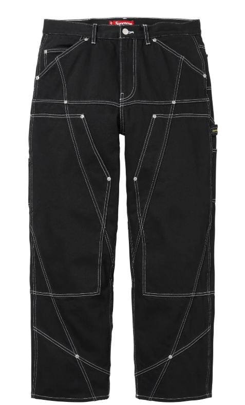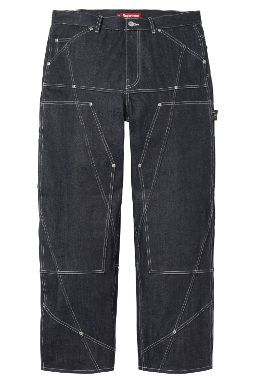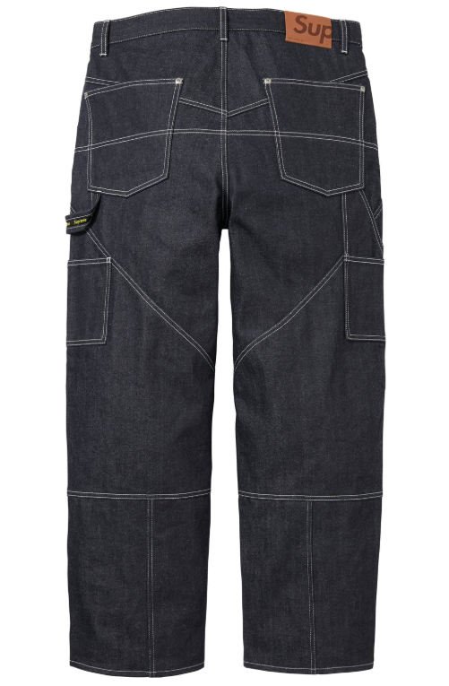 Supreme Contrast Stitch Double Knee Painter Jeanは、13オンスのコットンデニムを使用したルーズフィットのペインターパンツです。 幾何学的なコントラストステッチが施されたダブルニー補強が特徴で、ハンマーループやツールポケット、コインポケットを備えたワークウェアらしい実用性が高い一本。 Rigid IndigoやBlackなどのカラー展開で、ノンウォッシュの生地感がエイジングを楽しめます。ストリートからカジュアルまで幅広く対応する、26SSの定番デニムです。