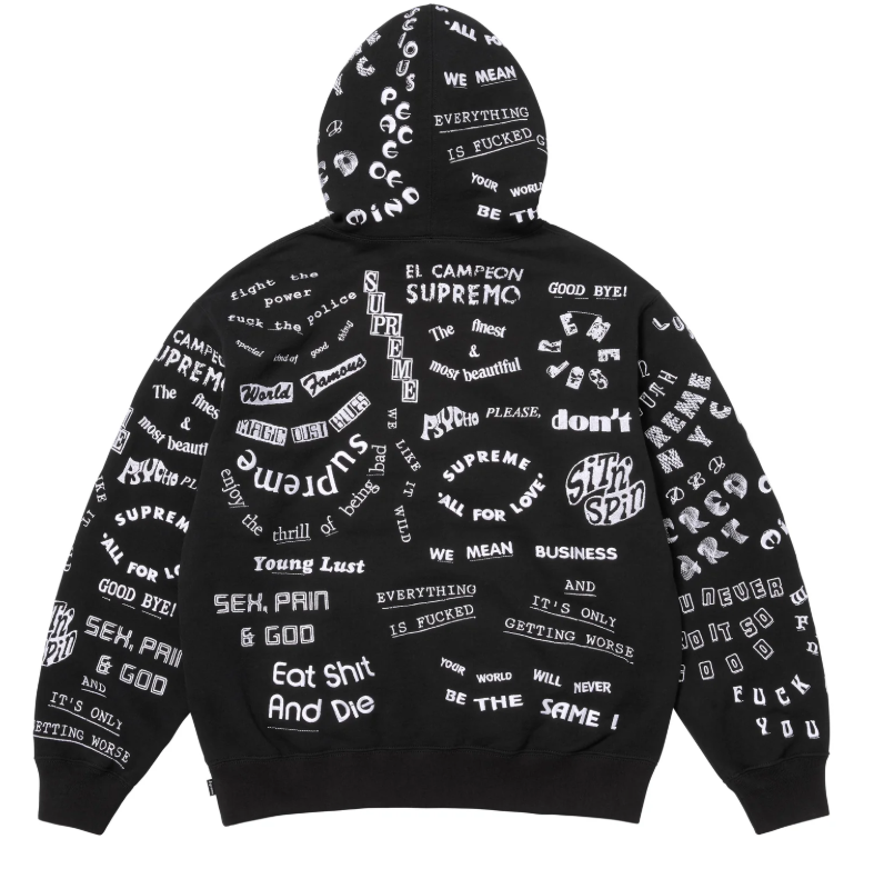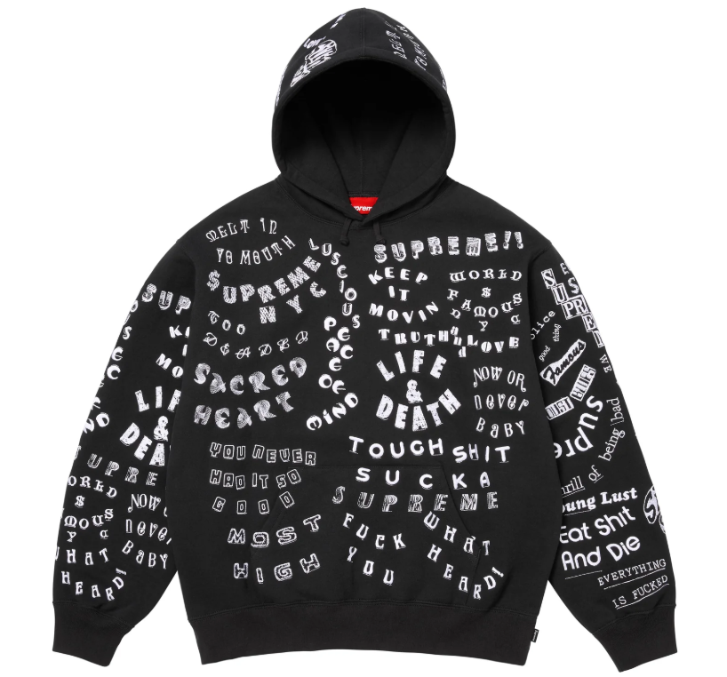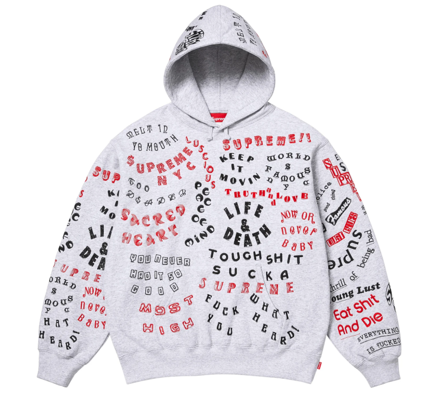 Supreme Too Deadly Hooded Sweatshirtは、ボディ全面に多様なフォントのメッセージ刺繍が総柄で施されたインパクト大なフーディです。ヘビーウェイト裏起毛スウェット素材で、レギュラーフィットのプルオーバー仕様。カンガルーポケットとリブ付き袖口・裾を備え、グラフィティ風のアート性が際立つデザインが魅力。1枚で主役級の存在感を発揮し、26SSの注目のスウェットです。(2/28時点日本公式サイト:展開無)